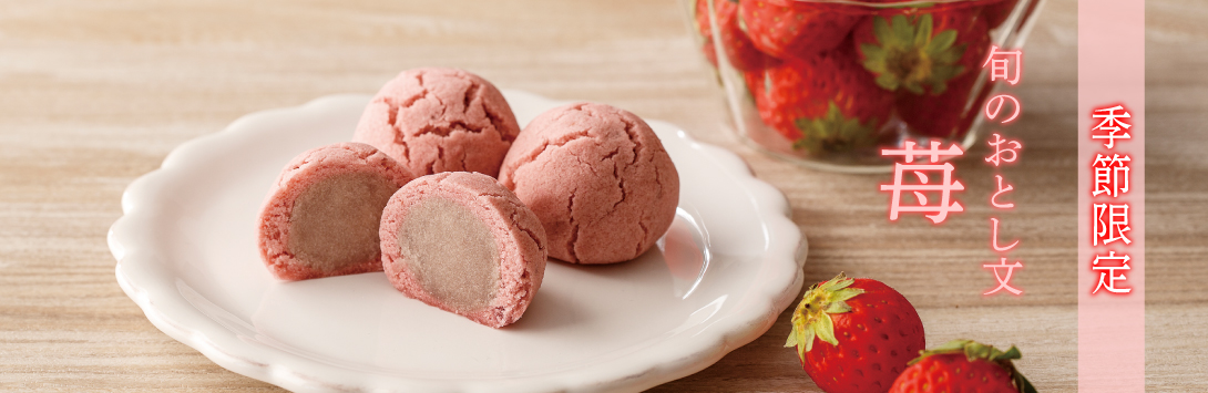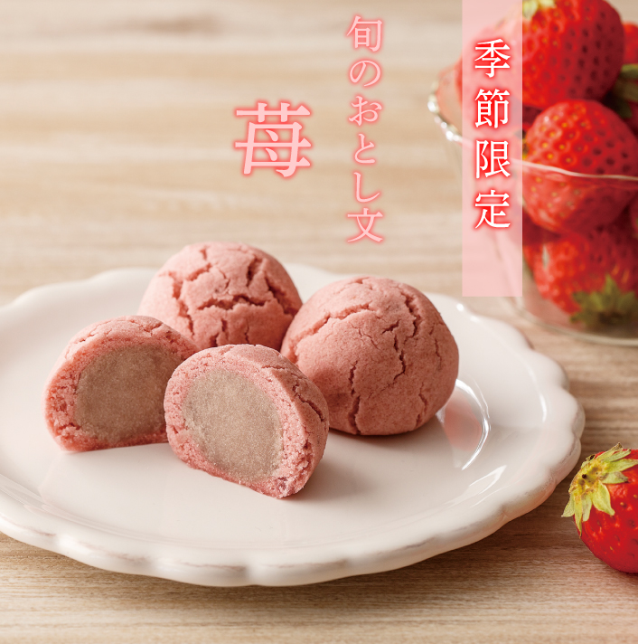 苺ピューレを煉り込んだ苺餡で、苺ミルク餡を包み蒸し上げました。まろやかな甘みの苺のしぐれ菓子です。